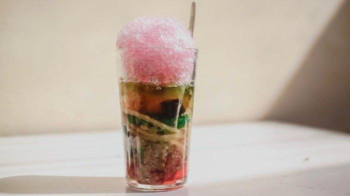 Es Tawon Kidul Dalem ini terdiri dari cincau, cendol, tapai, kacang hijau, mutiara, blewah dan sirup merah.