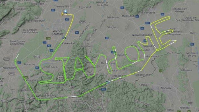 Tulisan di udara itu merupakan bentuk dukungan sang pilot terhadap kebijakan pemerintah Austria yang mengimbau warganya untuk tetap berada di rumah.