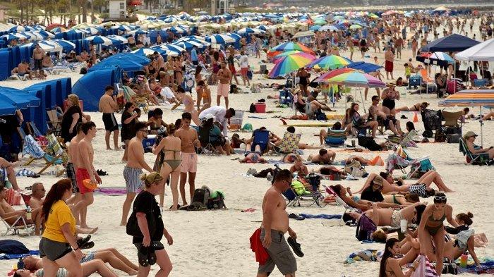 Dalam foto yang diambil pada diambil pada 17 Maret 2020 itu memperlihatkan Clearwater Beach yang berada di Florida ramai dikunjungi wisatawan.