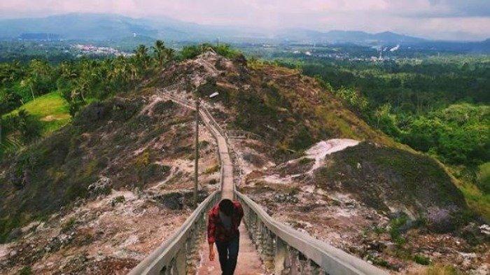 Bukit Kasih dilengkapi tangga panjang yang dikelilingi dengan ppemandangan kola belerang di sisi kanan dan kirinya.