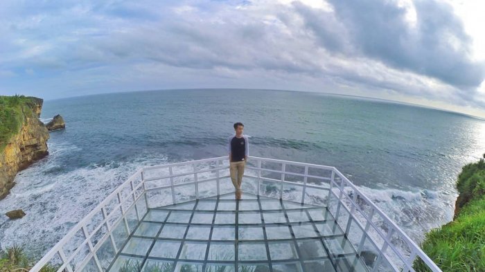 Spot favorit di pantai ini adalah teras kaca yang Instagramable sekaligus menawarkan sensasi menegangkan.