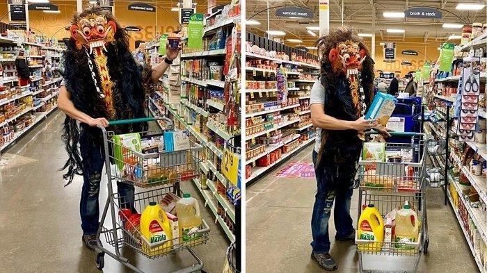 Melalui laman Facebook miliknya, Greg memilih untuk tampil nyentrik dengan berbelanja kebutuhan sehari-hari memakai topeng leak khas Bali.
