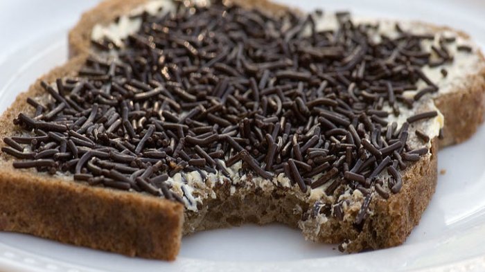 Konsepnya sama, roti diolesi dengan mentega dan kemudian ditaburi dengan hagelslag, seperti di Indonesia.