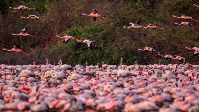 TRIBUNTRAVEL.COM - Kawanan flamingo bermigrasi dan mengubah Kota Mumbai, India, menjadi berwarna merah muda di tengah pandemi COVID-19.