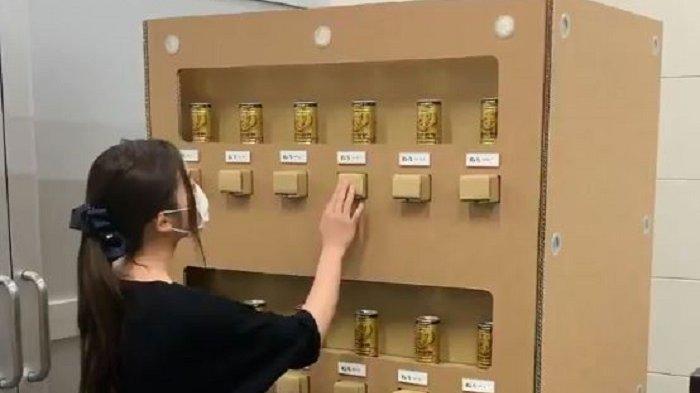 Dalam sebuah video yang diunggah oleh akun Twitter @dancreator, memperlihatkan seorang wanita yang yang sedang menggunakan mesin penjual otomatis dari kardus tersebut.