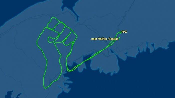 TRIBUNTRAVEL.COM - Seorang pilot asal Kanada, Dimitri Neonakis, membuat gambar kepalan tangan di udara saat ia menerbangkan pesawat di kawasan Nova Scotia, Kamis (4/6/2020).