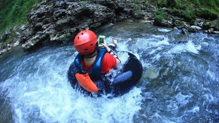 Pengunjung yang akan melakukan susur gua (cave tubing) pun wajib mengenakan helm yang sudah diberi face shield.