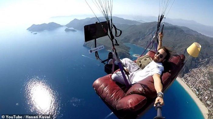 Instruktur paralayang ini menggunakan sofa kulit merah dengan bingkai logam yang dia pasang di parasut.