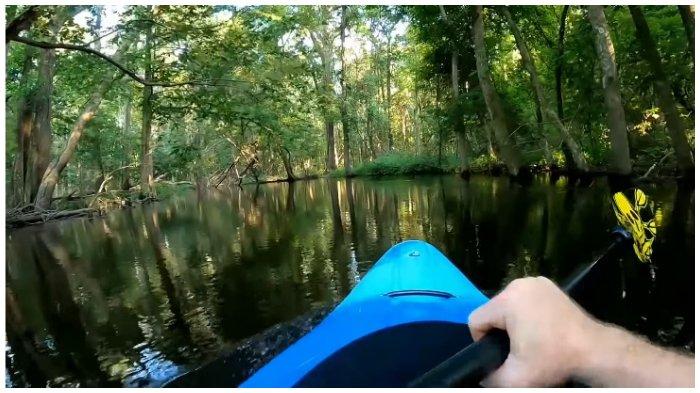 Dalam video, saat itu Joyce dan kayaknya menuju ke hamparan air tenang yang hanya dipenuhi oleh pepohonan serta ranting.