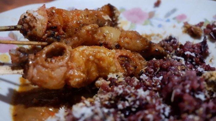 Uniknya penyajian kuliner ini terdiri dari sate usus berbumbu kacang yang dipadu dengan satu piring ketan hitam.