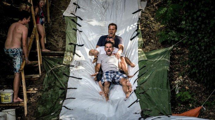Sebuah video menunjukkan wisatawan menggunakan perosotan ini tanpa perlengkapan pengaman.