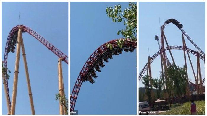 Sementara unggahan di platform Pearvideo juga memperlihatkan rollercoaster bernama Steam Flying Car ini terjebak di atas, sehingga penumpang tergantung dalam posisi terbalik.