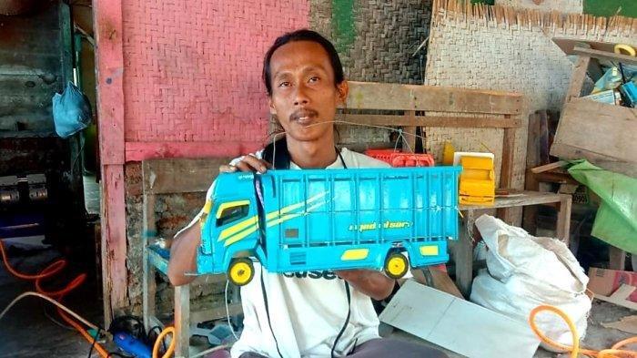 Pria berusia 38 tahun yang memang ahli dalam bidang mebel ini, setiap harinya bekerja membuat kerajinan miniatur mobil truk, pikap, mobil bus dan berbagai jenis mobil lainnya dari bahan kayu triplek dan pvc.