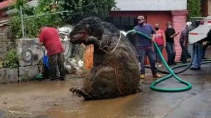 Dari foto-foto yang beredar menunjukkan tikus raksasa tersebut berada di jalan dan disemprot dengan menggunakan air.