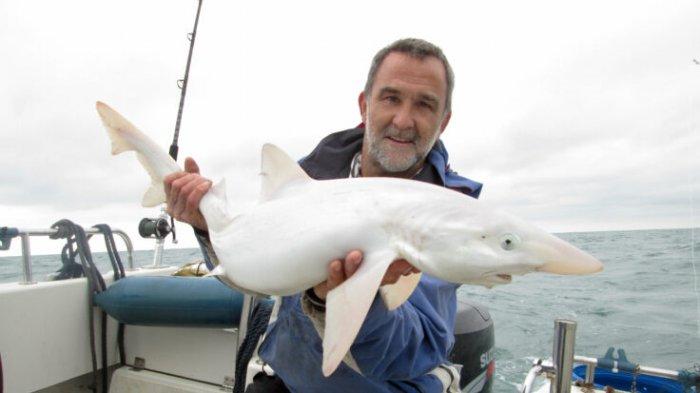 TRIBUNTRAVEL.COM - Seekor hiu putih leucistic tak sengaja ditangkap pemancing di lepas pantai Inggris.