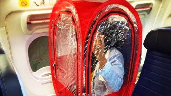 Tampaknya menjaga jarak sosial di dalam pesawat masih belum cukup bagi penumpang itu hingga harus memakai under weather pod.