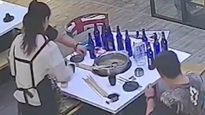 Pada rekaman CCTV, terlihat seorang pelayan perempuan sedang melayani dua pengunjung laki-laki yang duduk pada satu meja.