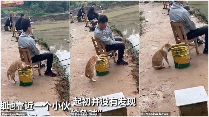 TRIBUNTRAVEL.COM - Ini adalah momen lucu ketika seekor kucing menyelinap di belakang seorang pemancing dan mencoba mencoba mencuri ikan dari ember pemancing.