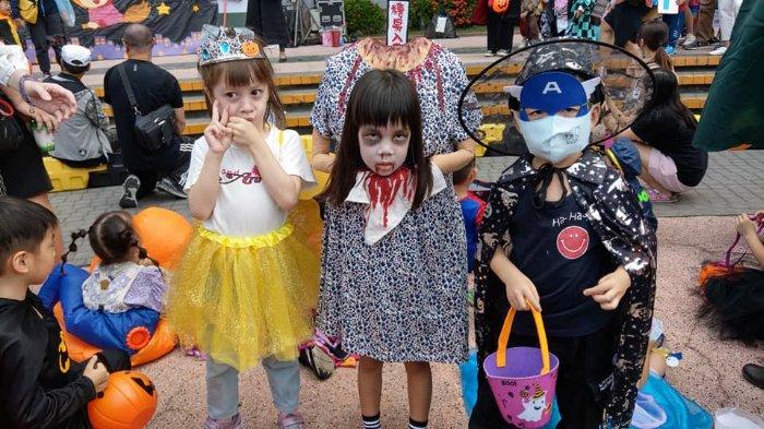 Ada juga foto yang memperlihatkan anak yang lebih kecil memakai bando dengan karakter labu khas karakter Halloween sedang memegang lampu yang berbentuk labu juga.