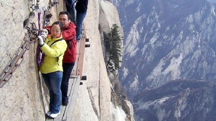 Tempat wisata paling berbahaya di China bisa kamu temukan di jalur pendakian Gunung Huashan.