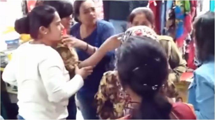 Dalam video tersebut terlihat wanita berkelahi di pasar yang sibuk dengan polisi mencoba menghentikan mereka.