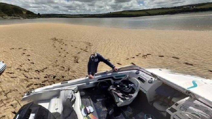 Hal ini menunjukkan bahwa air pasang telah surut meninggalkan perahu yang terdampar di pasir.