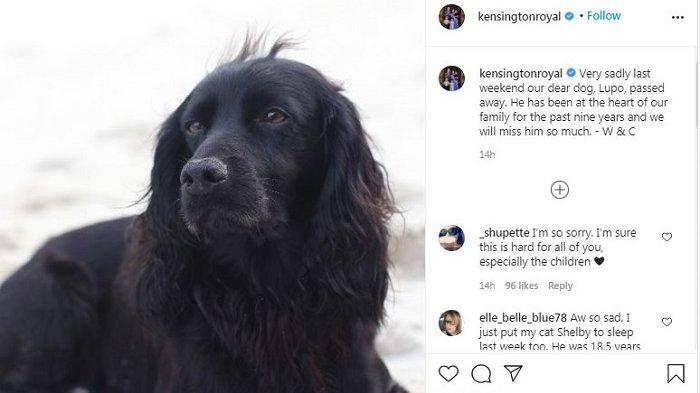 "Dengan sangat sedih Lupo, anjing kesayangan saudara perempuan saya Kate dan keluarganya, telah meninggal dunia. Lupo adalah putra Ella, saudara laki-laki Zulu, Inka dan Luna," tulis James pada keterangan foto.