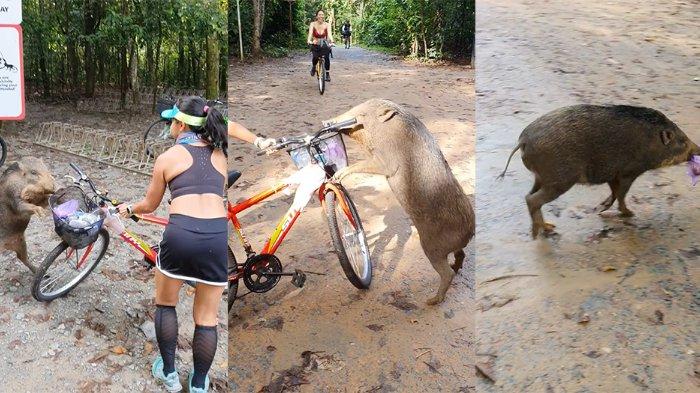Dalam sebuah video terlihat perempuan itu terlihat berusaha menangkis dan mengusir babi hutan dengan sepedanya.