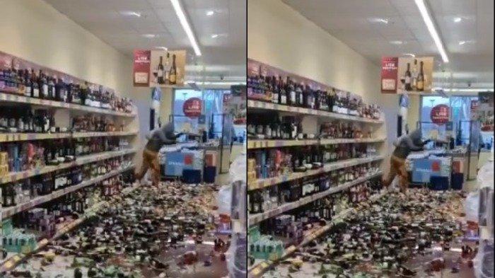 Setelah berada di dalam supermarket, ia kemudian mulai mengambil botol yang tersusun rapi dan menjatuhkannya ke lantai.