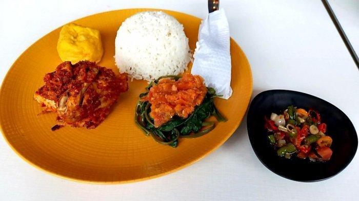 Satu porsinya terdiri dari nasi putih, ayam taliwang bakar, plecing kangkung, dan goreng tahu.