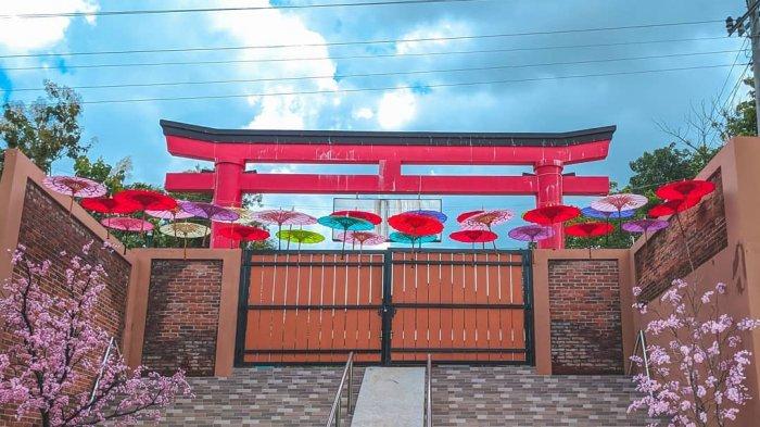 Ada juga area dengan hiasan bunga sakura yang letaknya dekat dengan gerbang Torii dan payung gantung warna-warni.
