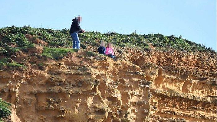 TRIBUNTRAVEL.COM - Seorang pria tampak membuat kedua anaknya yang masih kecil berpose di atas tepi tebing setinggi 150 kaki (45 meter) yang dikenal rawan longsor.