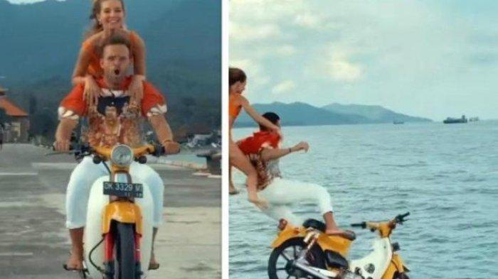 Melalui video itu terlihat seorang pria yang merupakan influencer asal Rusia mengemudikan sepeda motor bersama seorang teman wanita yang berdiri dengan satu kaki di jok belakang saat dia memasukkan motornya ke air.