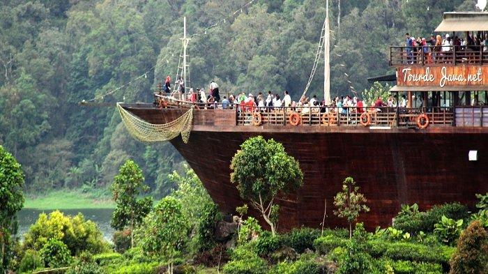 Restoran yang memiliki desain mirip dengan kapal pinisi ini menawarkan santap lezat dengan pemandangan pegunungan, danau dan hijaunya pepohonan sekitar.