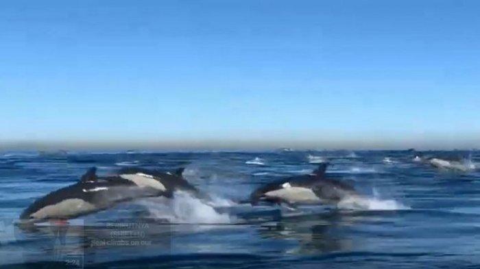 Dalam video tersebut, ribuan lumba-lumba terlihat melompat masuk dan keluar dari air (porpoising) dengan kecepatan tinggi.