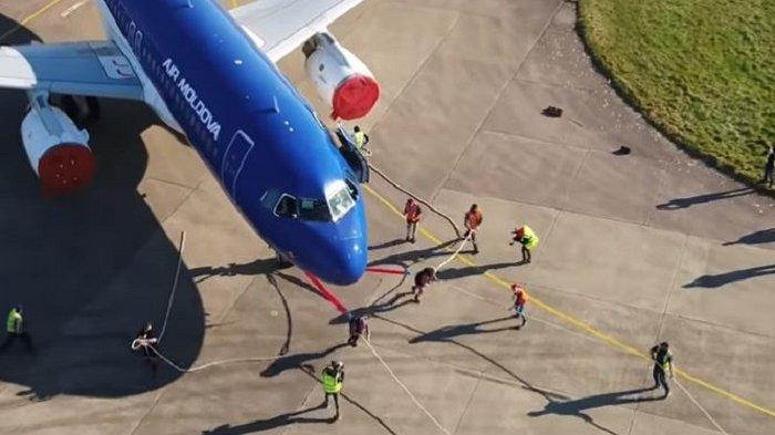Mereka harus menarik pesawat A320 seberat 48 ton melintasi landasan pacu di lapangan udara St Athan, Wales.