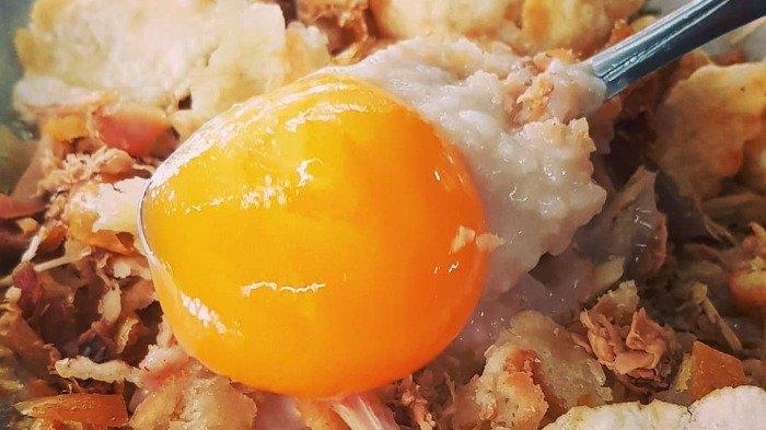 Dikatakan demikian karena bubur ayam di Kedai King disajikan dengan potongan cakue dan tambahan topping telur mentah.