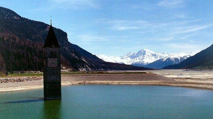 Akibat keringnya danau, sisa-sisa dari Desa Curon yang telah tenggelam selama lebih dari 70 tahun kembali terlihat.