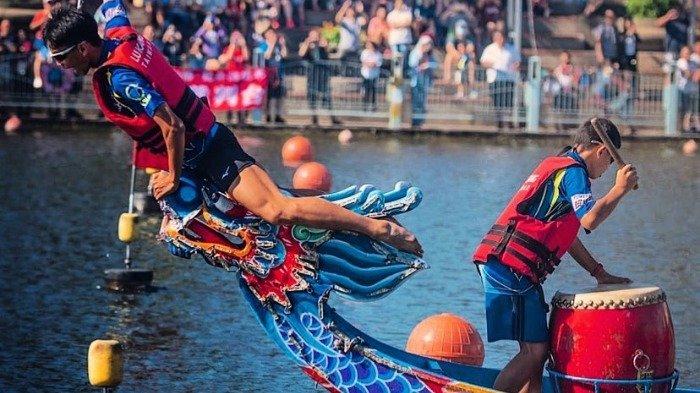 Seperti namanya, bagian paling seru dari festival ini adalah balapan perahu naga yang panjangnya bisa mencapai 40-100 kaki dengan 80 pendayung.