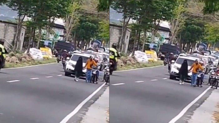 Di belakang wanita itu tampak sejumlah mobil dan motor yang berjalan pelan.