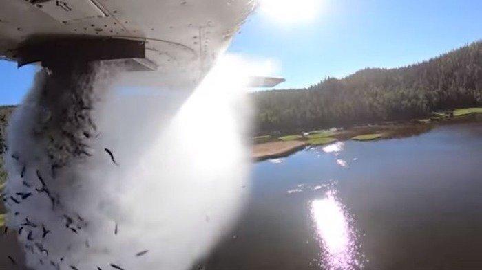 Sebuah kompartemen kemudian dilepaskan di bawah pesawat mengirimkan semburan air dan sekelompok ikan ke danau di bawah, lapor foxnews.com.