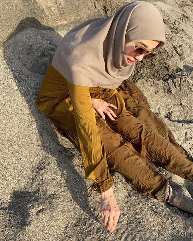 Ia bahkan terlihat asyik bermain pasir sembari menikmati sunset.