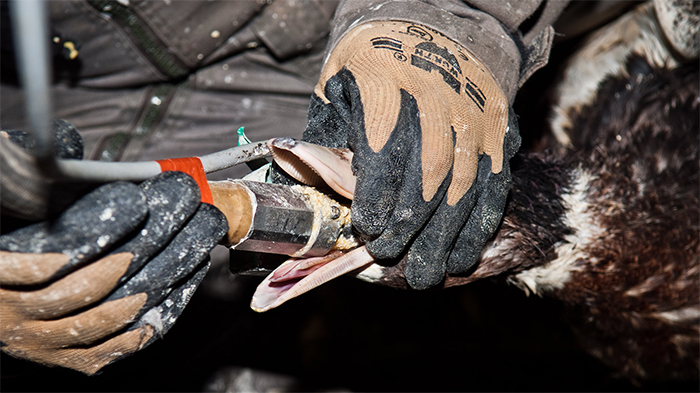 Sebuah tabung logam berisi sangat banyak makanan kemudian didorong ke tenggorokan burung untuk dimakan secara paksa.