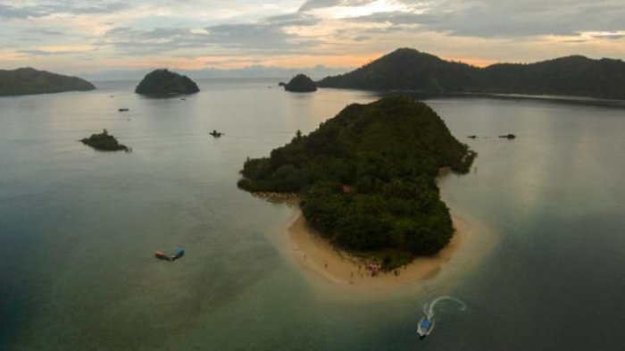 Pulau tak berpenghuni ini punya hamparan laut biru dengan perbukitan asri yang mengelilinginya.