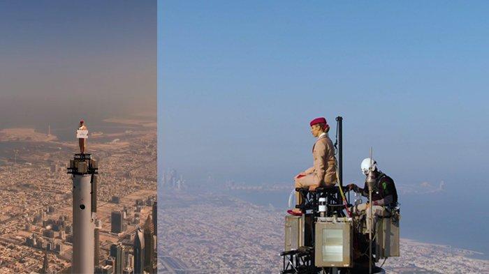 Dalam video itu, terlihat seorang pramugari yang mengenakan seragam lengkap berdiri di puncak Burj Khalifa.