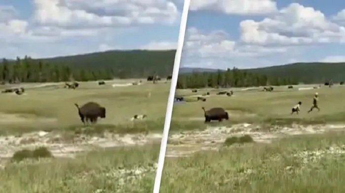Bison itu tampak mengejar wanita yang berada di padang rumput di Taman Nasional Yellowstone.