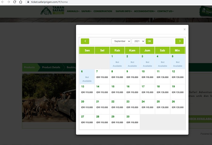 3. Lalu klik 'Continue', ada pilihan tiket masuk Taman Safari mulai Rp 115 ribu per orang, klik 'Check Availability'.