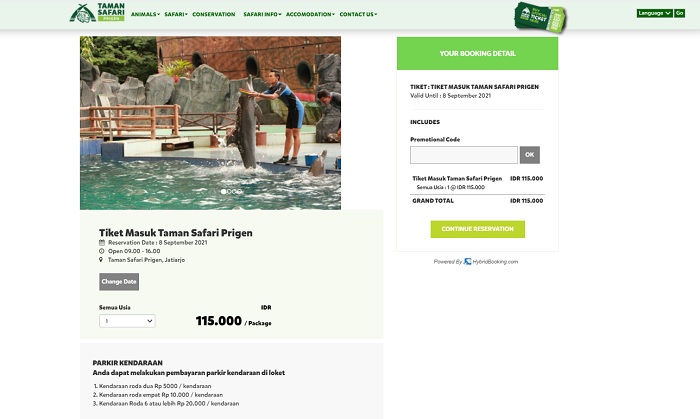 Tiket masuk Taman Safari Prigen bisa dibeli di situs resminya atau e-commerce seperti blibli, tokopedia, JD.ID, Shopee, tiket.com dan traveloka.