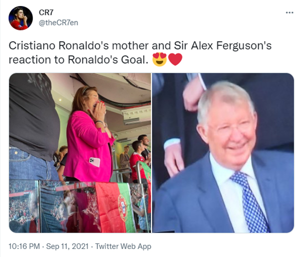 Dalam sebuah foto yang beredar di Twitter, Fergie terlihat tersenyum bangga menyaksikan Ronaldo.