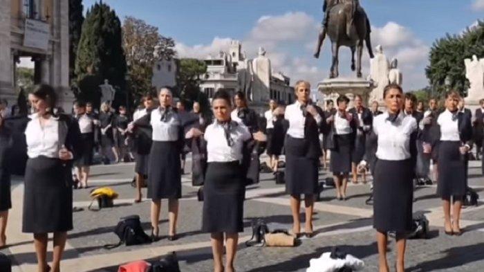 "Kami pertama kali datang untuk mengungkapkan rasa kecewa kami," ungkap salah seorang mantan pramugari yang ikut serta dalam aksi flash mob di Roma.